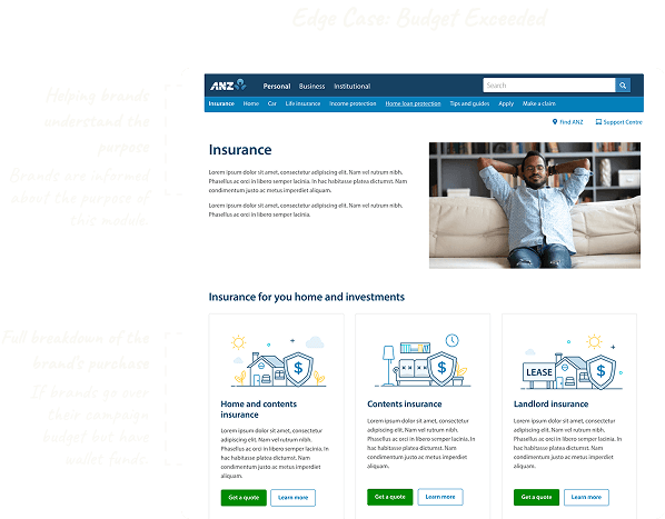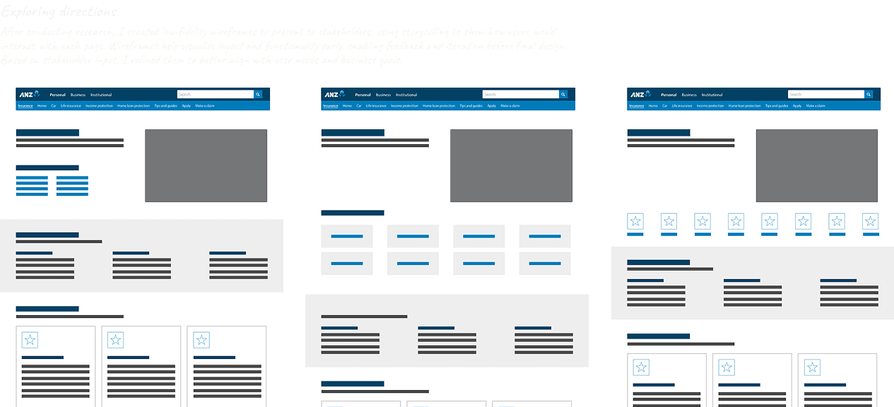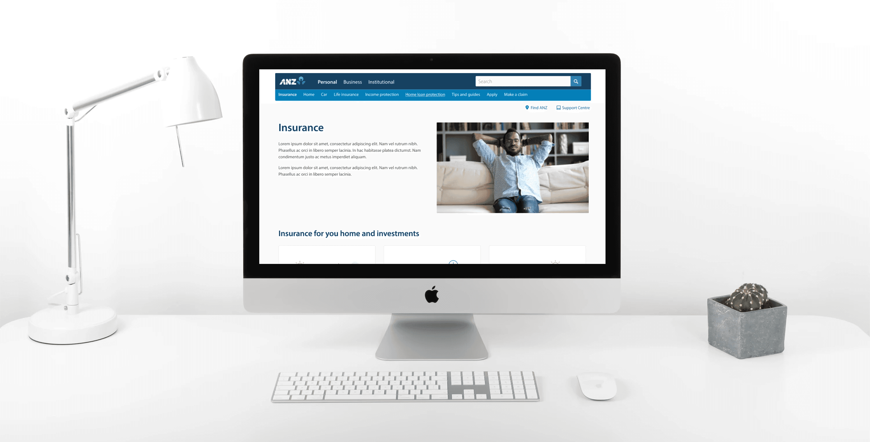ANZ's insurance and personal banking pages were underperforming on conversions, time on page, and click-through rates. As the sole designer for the first three months, I owned the full process from auditing the existing experience, developing wireframe directions, and running A/B testing through to shipping the final designs.