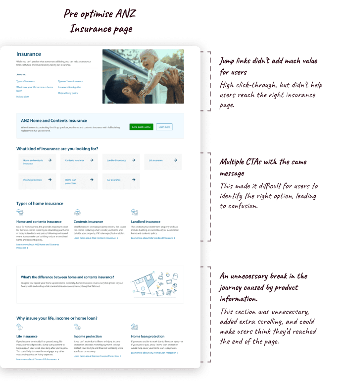 The “ANZ Home and Contents Insurance” call-to-action was positioned too early in the page hierarchy, before users had built enough understanding of the product. It was being skipped rather than acted on.