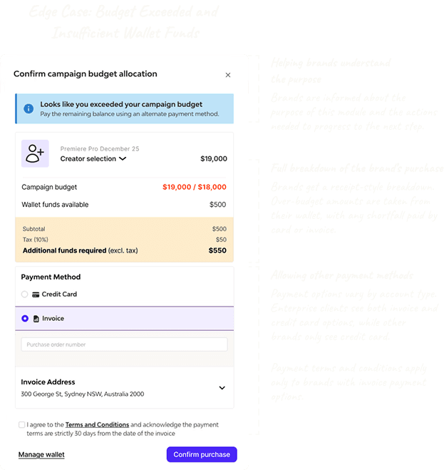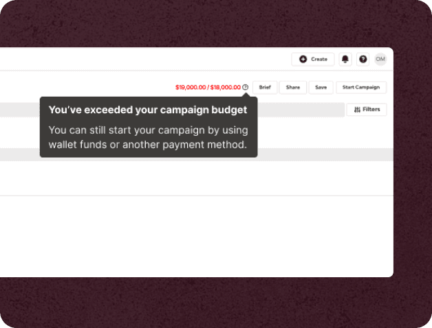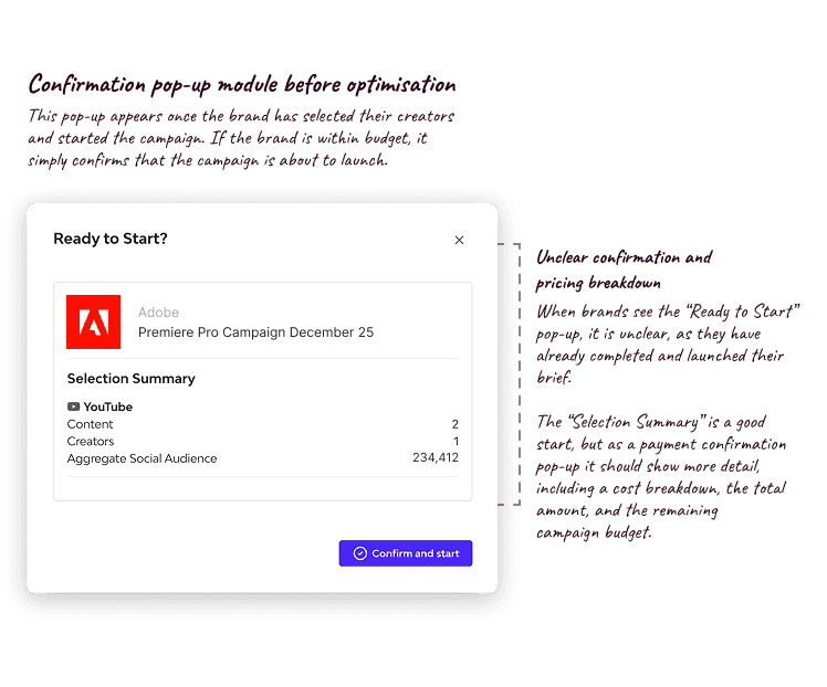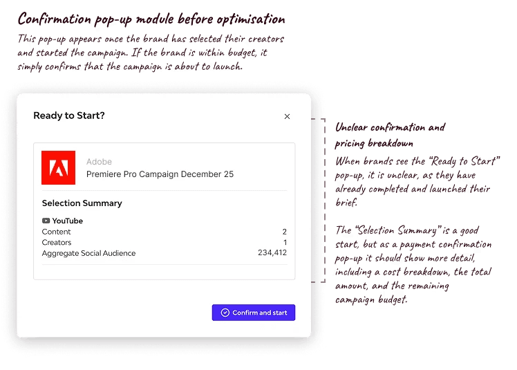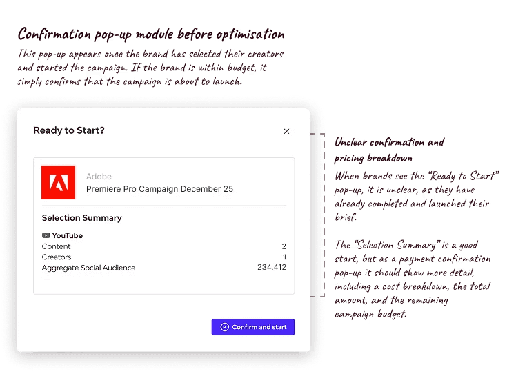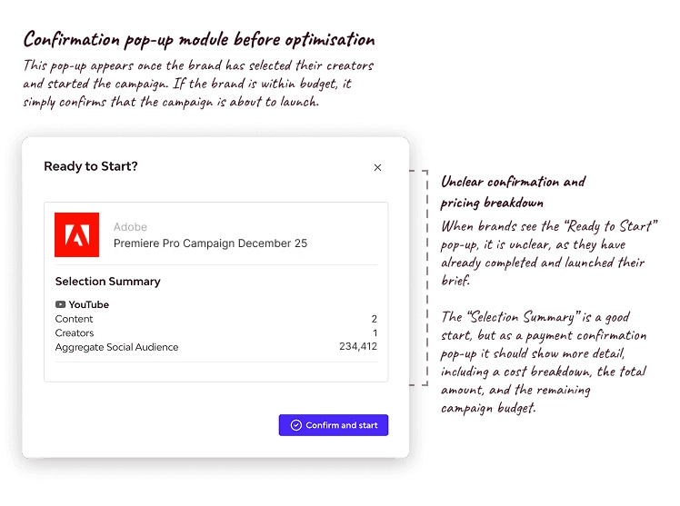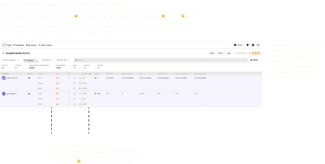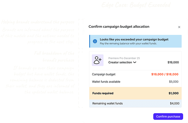 The goal was to help users understand what happened, why they could not proceed, and how to resolve it. The flows allowed users to increase their budget or adjust creator selections so they could continue their campaign.
