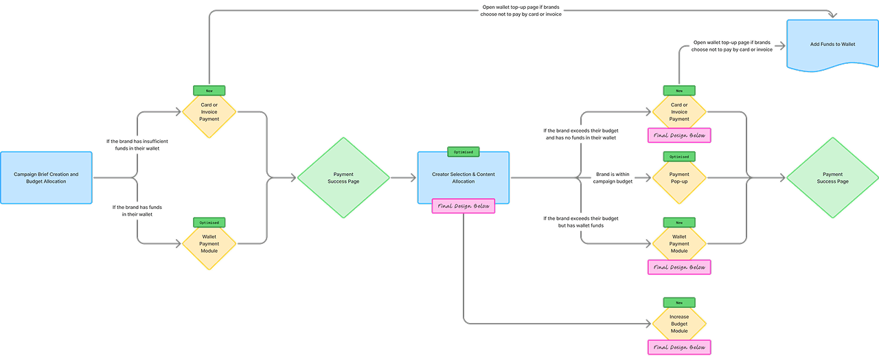 To improve the experience, we focused on how brands interacted with the payment system. The goal was to identify where confusion and friction occurred in the process and how this was impacting their ability to manage and understand campaign payments.